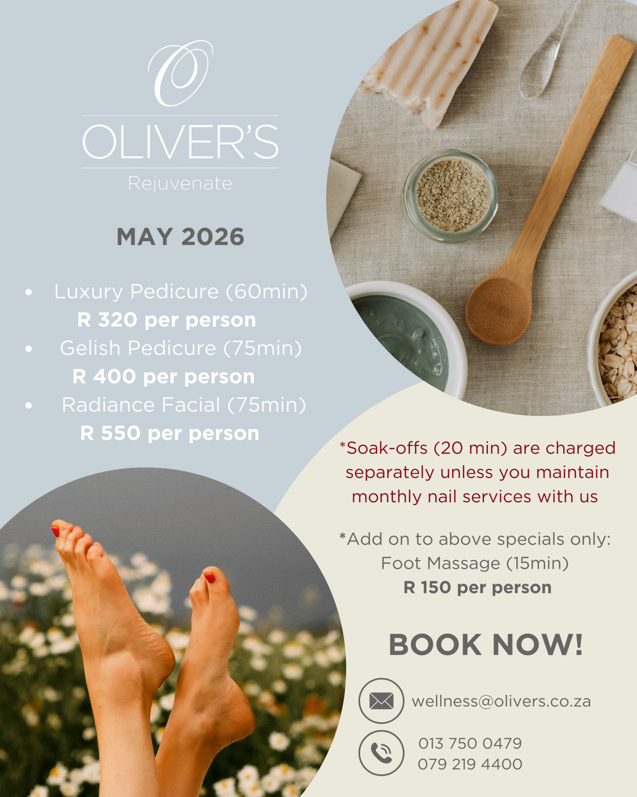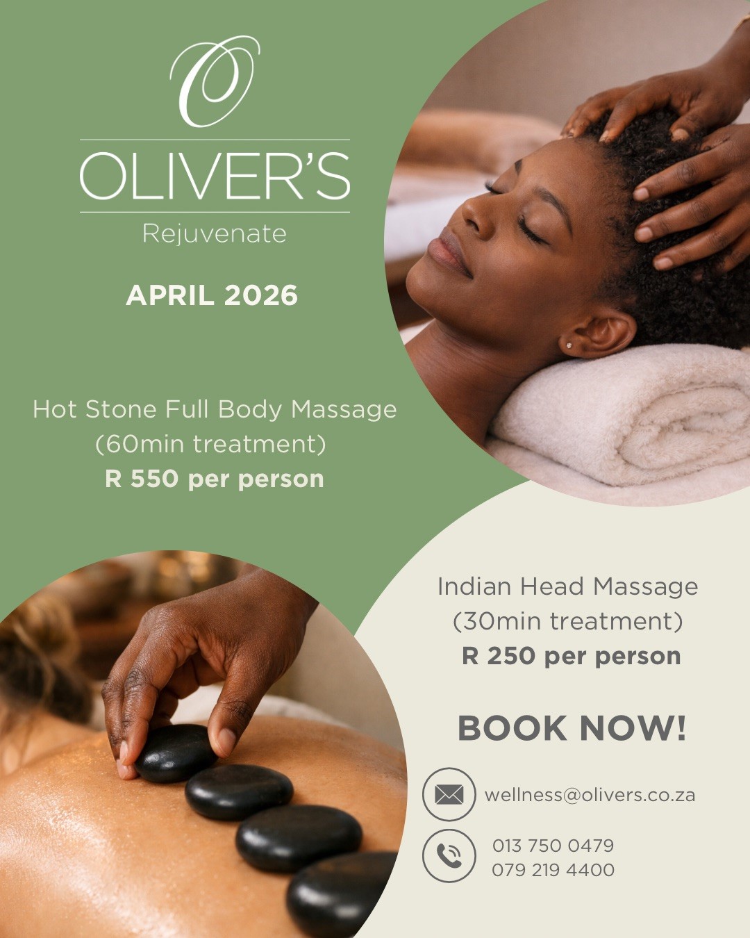 Shaltin Farie Muchena03/05/2023 best food ever.will definitely recommendPosted on Ba TJ Tada01/01/2023 Cosy, peaceful location, objective personnel, and worthy.Posted on Reinette Mare16/06/2022 Had a great spa experience. Friendly therapist, clean and tranquil facilities. I highly recommend these Wellness Centre. 🌸Posted on Lizette Steenberg03/03/2022 Everything!!!! Restaurant with divine foods, professional staff, amazing spa & beauty treatments👌🏻Posted on Jean Cash28/12/2021 We had the best food today at Oliver's the cheese board was my favorite my wife didnt even give me a piece of her pork belly ... 😂😂😂 Yvonne our attendant was also very pleasant thanks for an amazing timePosted on Martin Jessen28/11/2021 Exceptionel Food and great Food, fantastic VenuePosted on Tshegofatso Mpotoane24/11/2021 Tooooo amazing no words could ever explain, service there the best the restaurant there great and the people there are always smiling 😊😊Thank had the best timePosted on Honey Mamabolo19/11/2021 I was bowled over by this hidden gem. it was my first time in Whiteriver and Oliver's left a mark. I will definitely return and recommend it without reservation.Posted on Yvette Maine11/11/2021 What a wonderful evening. Service was 5* and the food out of this world. Will definitely be our go to Restuarant again. So excited we got to experience it after so many friends recommending it. Lovely friendly hostess as well. Thank you Yvette and PaulPosted on
