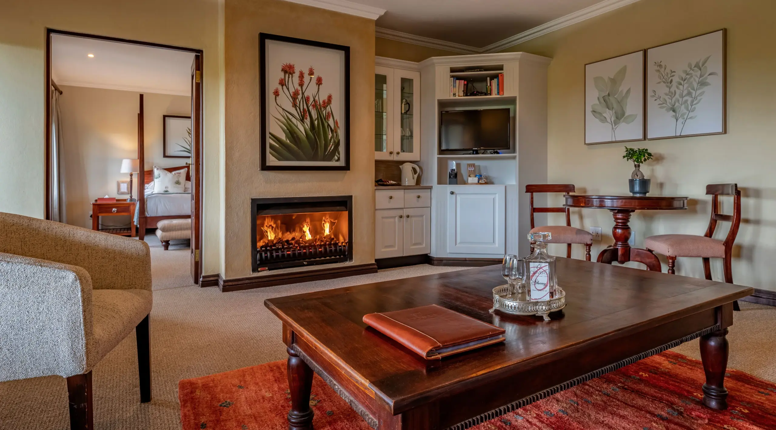 Our two Executive Suites, are located on the 1st floor in the building adjacent to the main hotel. These luxuriously furnished rooms (each 100m2) have spacious and private balconies with stunning views over the gardens, pool, golf course and surrounds. The suites have an entrance hall with a guest toilet, a separate lounge and bedroom area each with a fireplace.